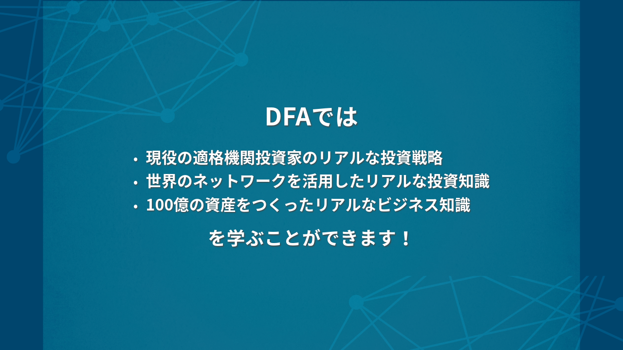 DFAでは普段市場にはでないリアルな情報や知識を学べる唯一の場所です。